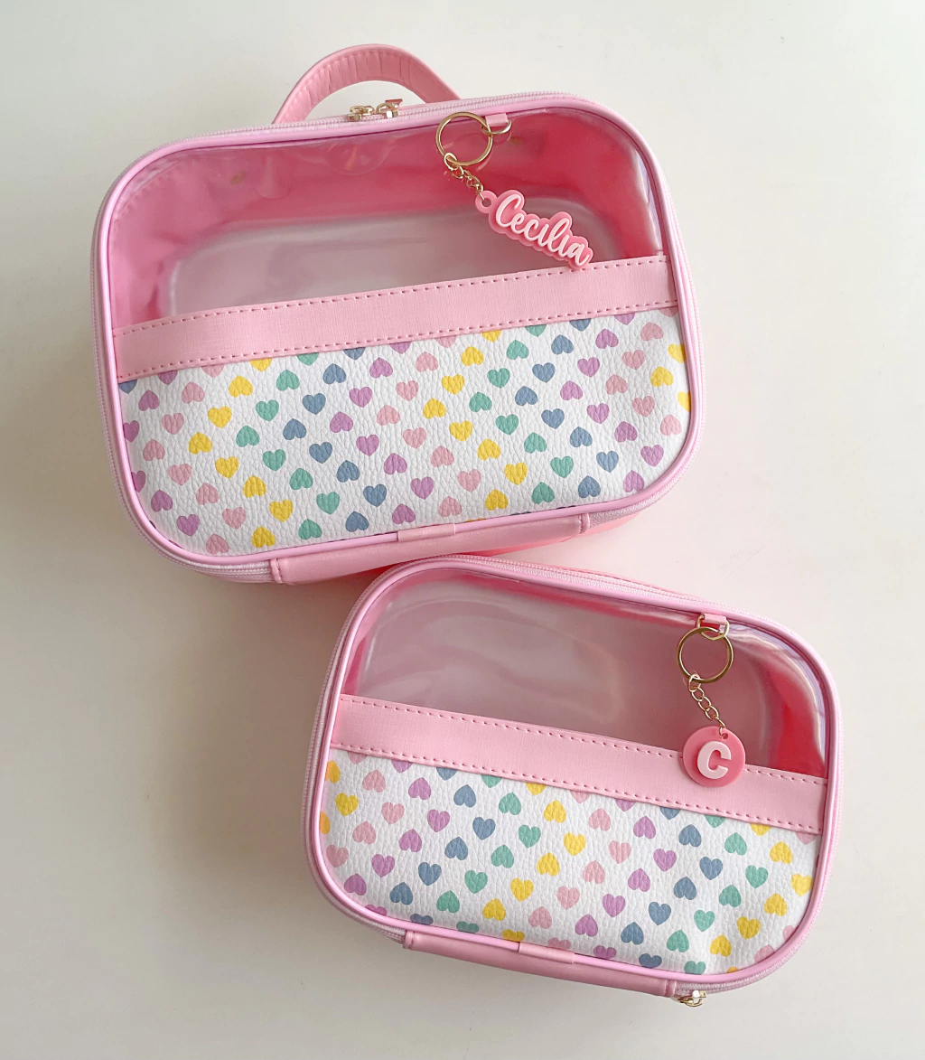 A Necessaire PP mede 15 A x 22 C x 8 P e acompanha 1 chaveiro com inicial em 3D.