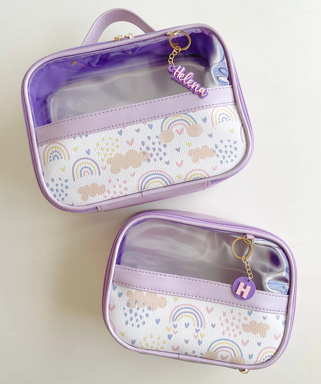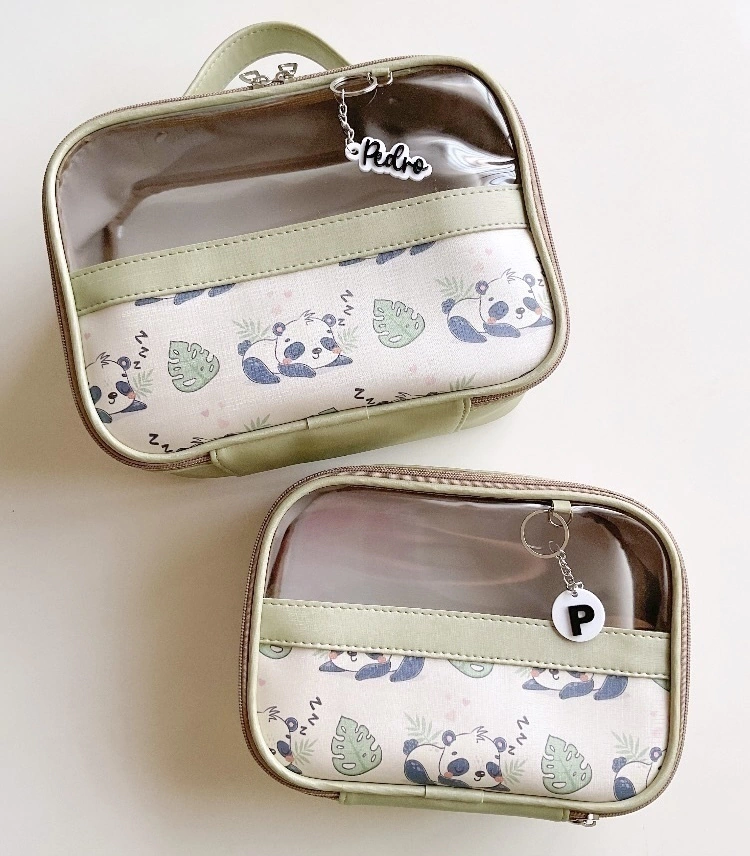 Kit de organizadores produzidos com cor única e uma faixa frontal estampada. Possui transparência na frente e total no verso.
