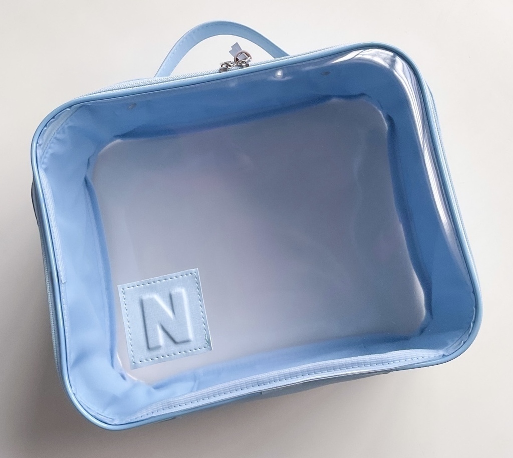 Maleta organizadora multiuso, de cor única e com transparência na frente e no verso.