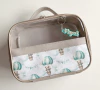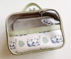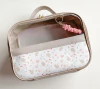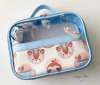 Maleta multiuso produzida com cor lisa e uma faixa frontal estampada. Possui transparência na frente e total no verso.
