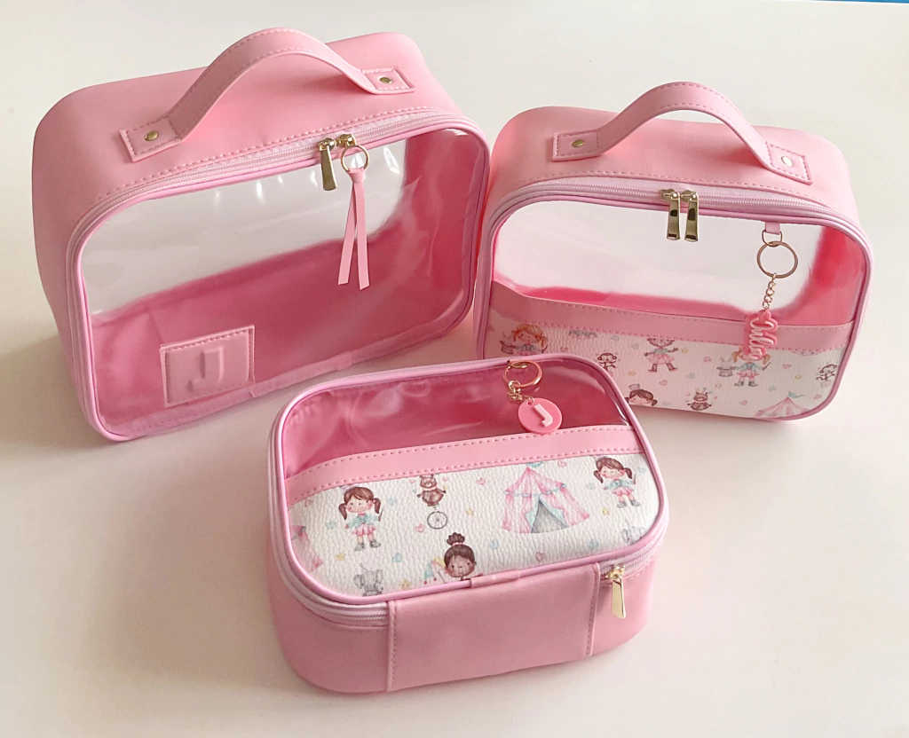 Escolha entre chaveiros 3D ou plaquinhas espelhadas para a personalização do Organizador Sol P e da Necessaire Sol PP e informe ao finalizar a compra.